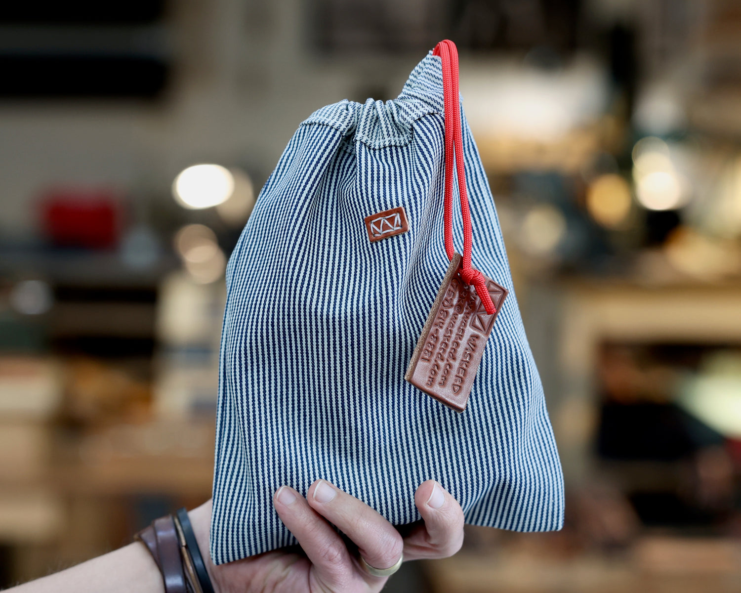 Your belt will be packaged in a small drawstring bag. We use the scraps from our tool-bag-style bags to make these in either striped denim or canvas.