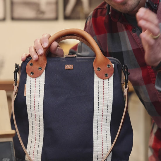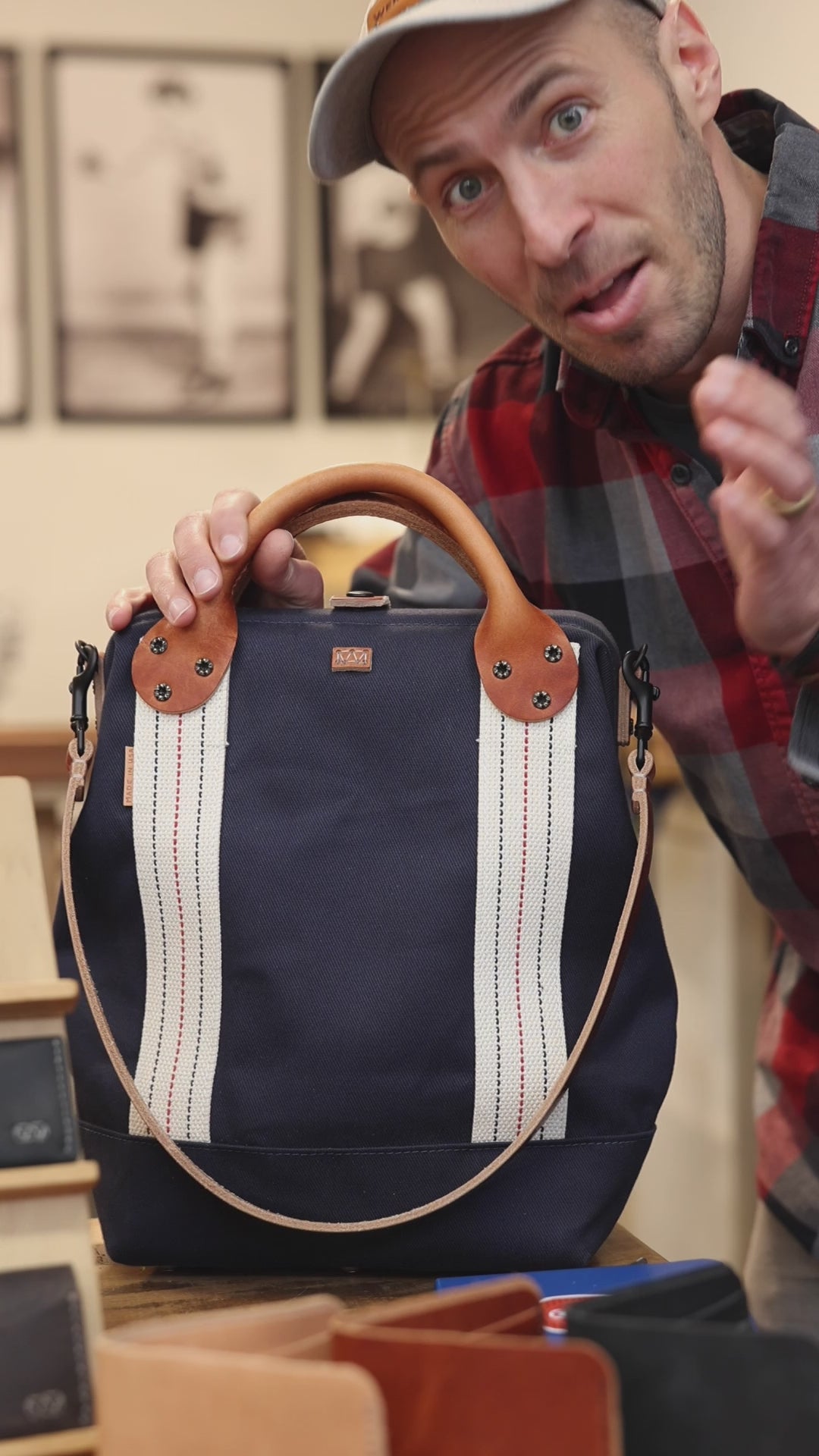 This is the old mason's bag I found in the back of my parents' shed growing up that inspired my line of "Tool-Bag-Style" bags. I loved the way it opened, and I thought with a few added details it would be a really fun bag to carry.
