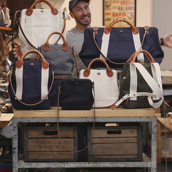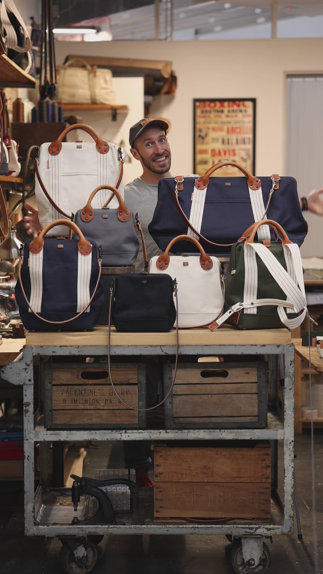 The Weekender was inspired by the old tool bag I found in the back corner of my parents' shed. It is the perfect size for a weekend trip. It accommodates an extra pair of shoes plus a few days of clothes and still fits in the overhead bins on the small regional airplanes. Just wait until you walk out the jet bridge past everyone waiting for their dinky roller bags that had to get checked underneath the plane and you'll remember why you chose grit over rolling convenience.